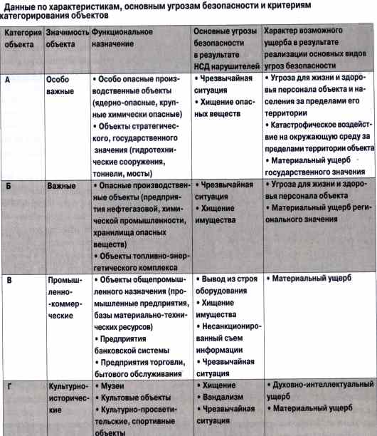 К вопросу о категорировании объектов о позиции охранной бозопастности В статье рассматриваются основные положения концепции обеспечения комплексной и охранной безопасности важных объектов РФ. Для определения необходимого уровня защищенности предлагается категорировать объекты по характеру и масштабу возможного ущерба в случае реализации основных угроз безопасности в результате несанкционированных действий нарушителей. Рассматриваются порядок и этапы работ по созданию системы охранной безопасности объектов В современных условиях задача обеспечения безопасности важных российских объектов требует комплексного научного подхода. Ее решение для конкретного объекта целесообразно начинать с разработки концепции обеспечения безопасности. Концепция безопасности выражает общий замысел организации и реализацию мер по обеспечению защиты объекта от возможных угроз. Суть концепции обеспечения комплексной безопасности любого объекта поясняется на рис. 1 и заключается в претворении в жизнь трех принципов: определение целей (предметов) защиты (ко- го и что защищать?); определение и оценка угроз (от кого защи- щать?); разработка и реализация адекватных мер за- щиты (как защищать?). Цели защиты На охраняемом объекте в принципе существуют три цели защиты: люди (персонал объекта, население прилегающей территории); имущество (оборудование, ценности, документация); информация (конфиденциальная, служебная или коммерческая). Виды угроз Цели защиты образуют пространство угроз. В обобщенном виде основными видами угроз безопасности объекта являются: чрезвычайная ситуация (авария, пожар, наводнение, разрушение, массовые инфекционные заболевания и отравления людей и т.п.); хищение (утрата) имущества; несанкционированный съем информации, содержащей коммерческую или служебную тайну. Система обеспечения комплексной безопасности объекта должна быть сформирована таким образом, чтобы с помощью людей и технических средств эффективно противостоять перечисленным угрозам путем принятия адекватных мер защиты. Подсистемы безопасности Для этого должны создаваться и надежно функционировать следующие подсистемы безопасности: система защиты объекта при чрезвычайных ситуациях; система физической защиты (охранной безопасности); система информационной безопасности. Из всех угроз самыми опасными являются чрезвычайные ситуации. Последствия ЧС на некоторых объектах могут привести не только к большому материальному ущербу, но и вызвать угрозу для жизни и здоровья персонала объекта и населения за пределами его территории, а также негативное воздействие на окружающую природную среду. Необходимость создания СОБ или СФЗ Основными источниками (причинами) возмкновения ЧС на объектах, кроме природных и техногенных, являются злоумышленные несанкционированные действия (НСД) нарушителей. Следует отметить, что в современных условиях НСД нарушителей представляют особую опасность, так как могут привести к возникновению любой из представленных на рис. 1 угроз. Поэтому создание эффективной системы охранной безопасности (СОБ) или физической защиты (СФЗ) является весьма актуальной задачей для многих промышленных объектов России. Необходимость организации физической защиты предусмотрена законом РФ "О промышленной безопасности опасных производствен